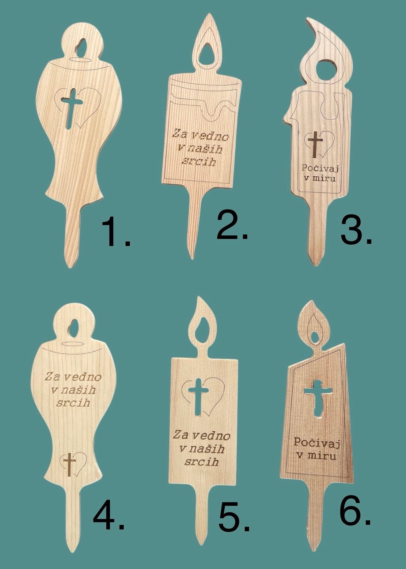 Masivna lesena sveča, zasnovana kot trajnostna in estetska alternativa klasičnim nagrobnim svečam. Ročno izdelana iz kakovostnega lesa in okrašena z vgraviranim motivom po meri. Sveča se preprosto zapiči v zemljo ter služi kot spoštljiv in naraven spomin na pokojne.