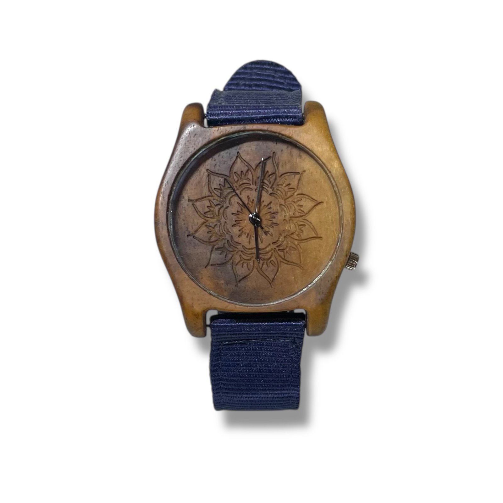 A watch made of walnutwood, with a unique pattern in the dial and a blue leather strap.