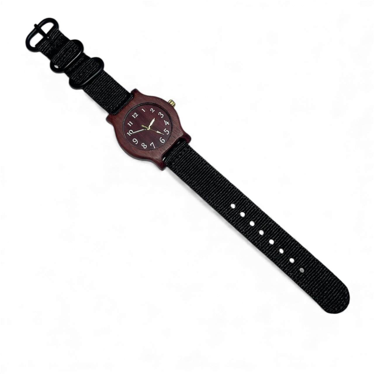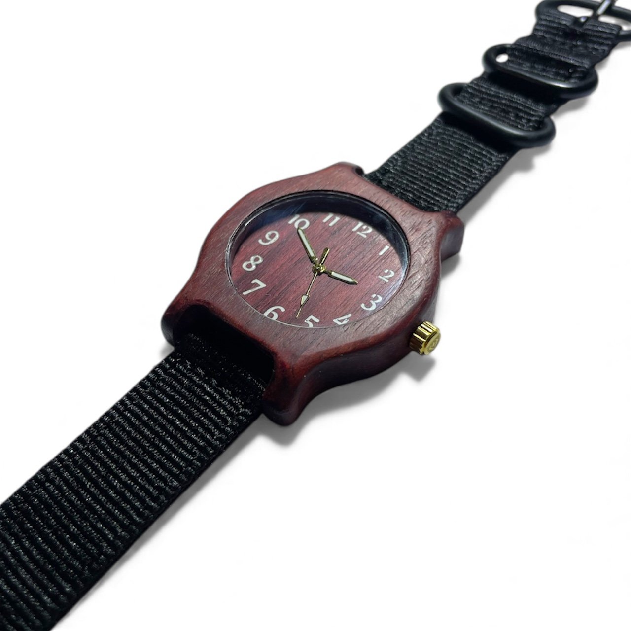 A watch crafted from amaranth wood, featuring white numerals and a black strap.