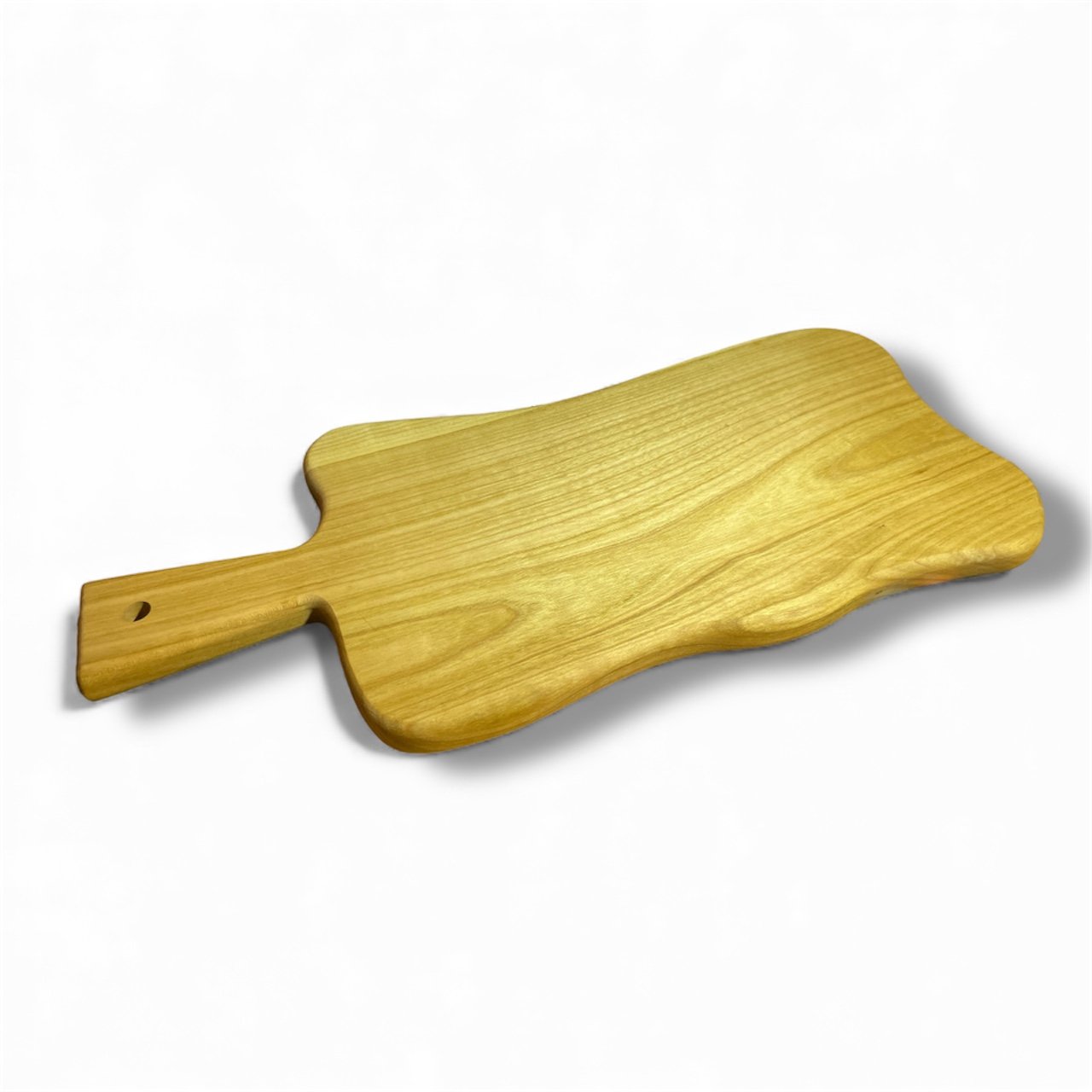 A cherry wood cutting board. The board is treated with tung oil, and any cracks are filled with a food-safe resin.