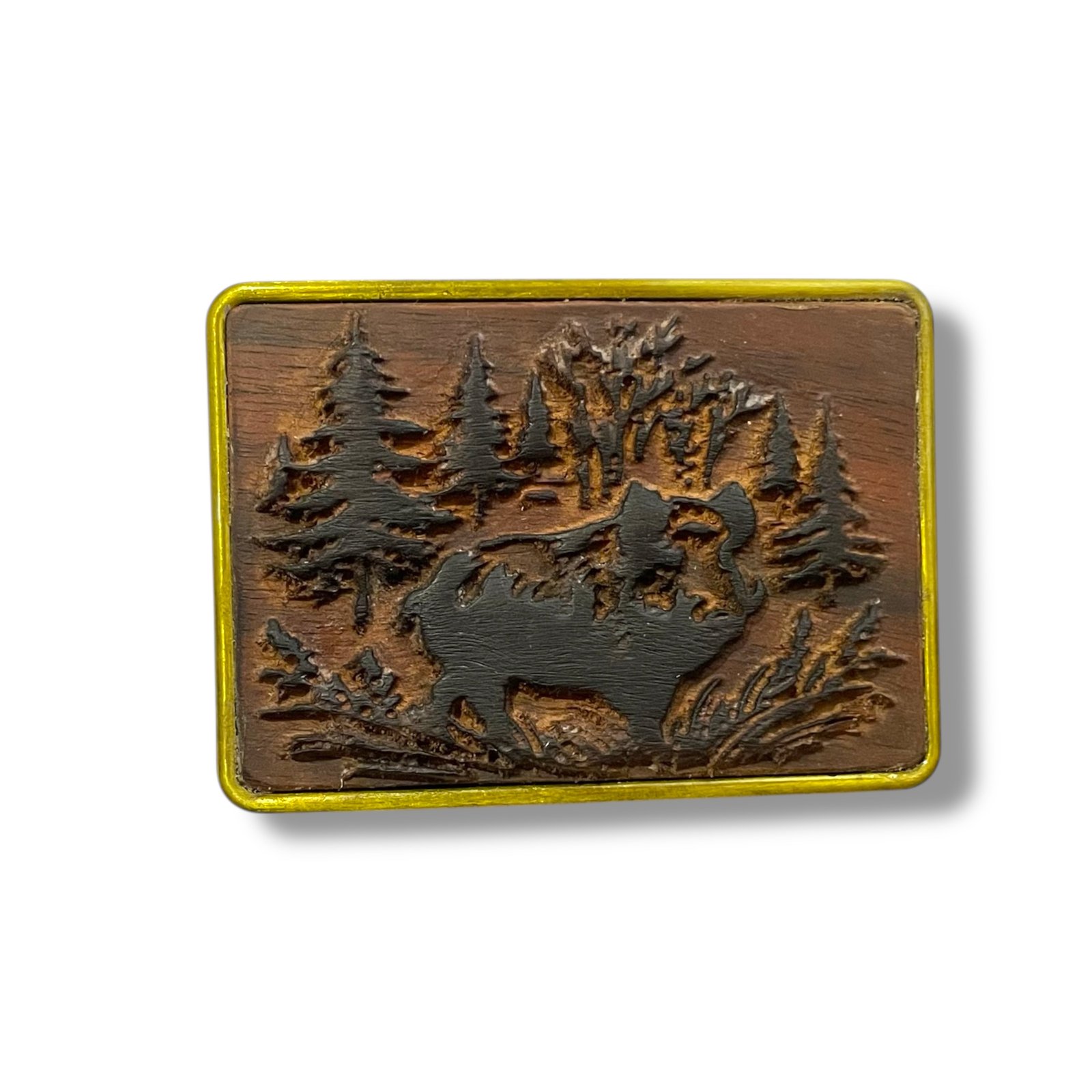 Elegantna zaponka za pas s kovinsko osnovo in vstavljenim lesenim elementom z izrezljanim motivom divjega prašiča.