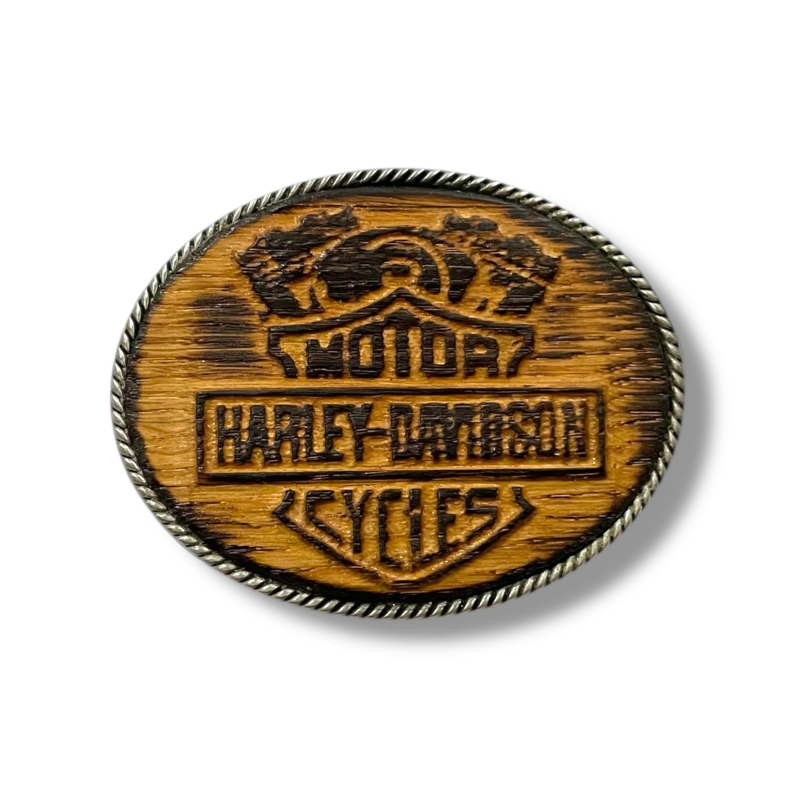 Elegantna zaponka za pas s kovinsko osnovo in vstavljenim lesenim elementom z izrezljanim motivom Harley Davidson Motor Cycles.