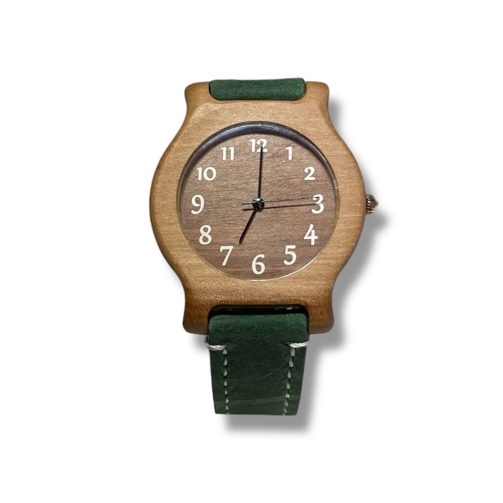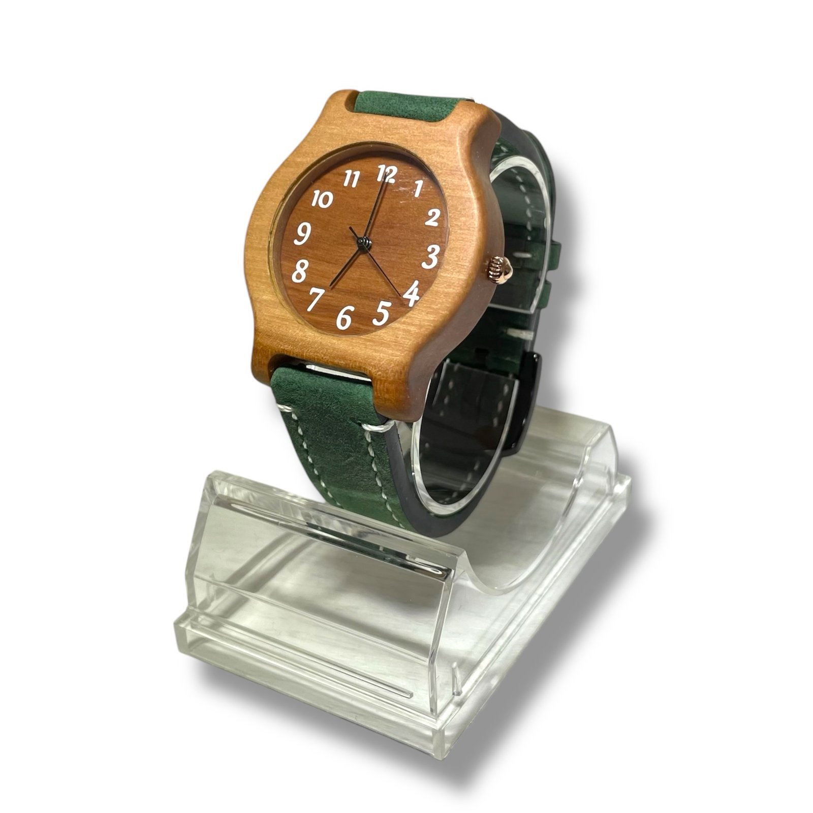 Ura iz lesa jablane, z številkami bele barve ter zelenim paščkom.