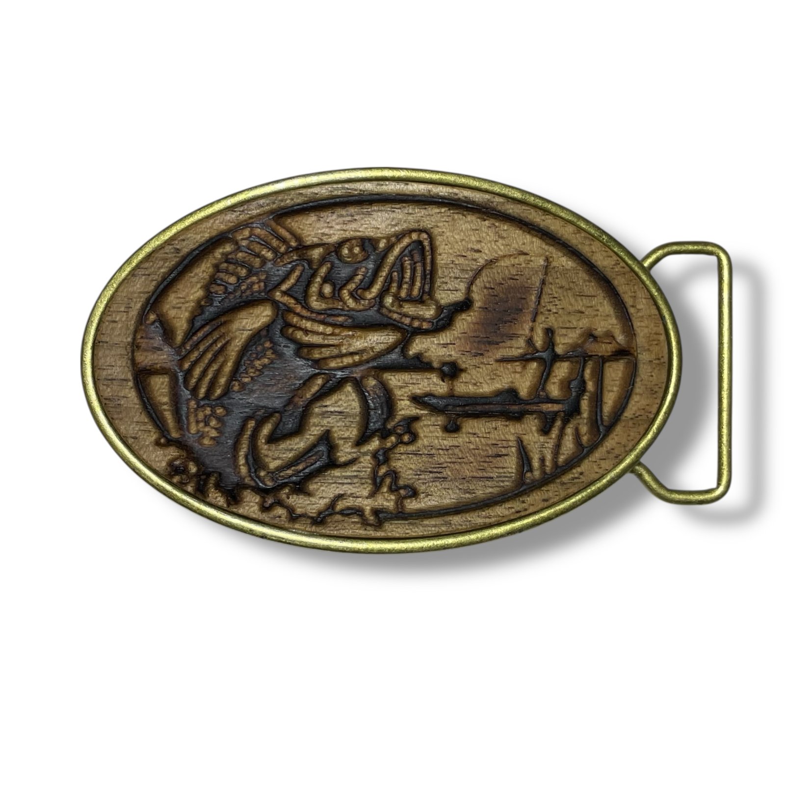 Elegantna zaponka za pas s kovinsko osnovo in vstavljenim lesenim elementom z izrezljanim motivom ribolova.